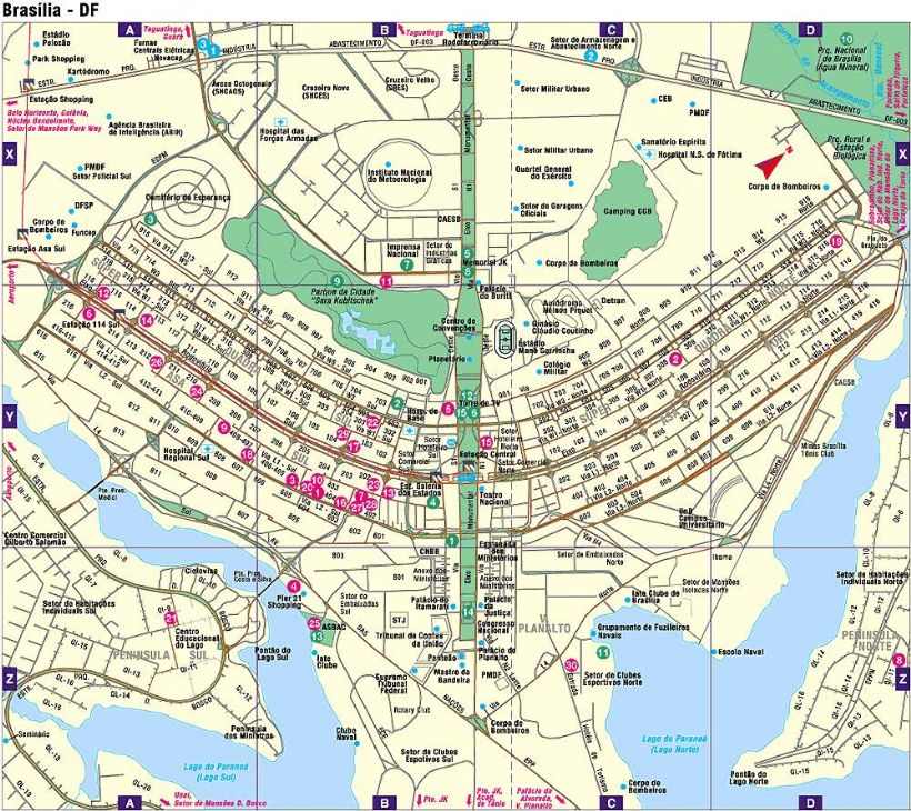 O mapa de Brasília é parcial e não inclui alguns bairros, como os Setores Sudoeste e Noroeste, além de parte do Lago Sul e Norte, entre outros. Por isto pedimos desculpas e esperamos em breve substituir este mapa por outro mais completo.